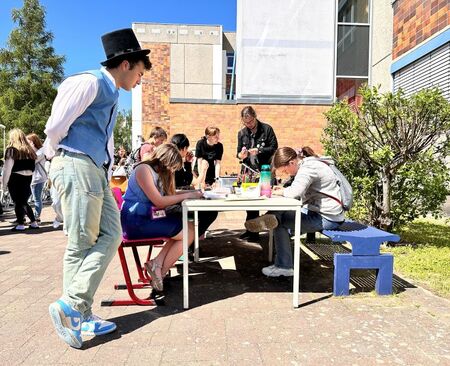 Weiter konnten sich Tattoos auf die Haut gemalt, Sonnenblumen aus aller Welt erworben und Buttons selbstgestaltet werden. Auch die Feuerwehr war mit einem Einsatzwagen vor Ort, ebenso die Bogenschützen. Der Stand mit den selbstgemachten Ölen war ein Renner sowie die Feuerschale mit dem Stockbrot. Immer präsent war Mohammad aus der 10b, unser Caspar David Friedrich mit Weste und Zylinder.